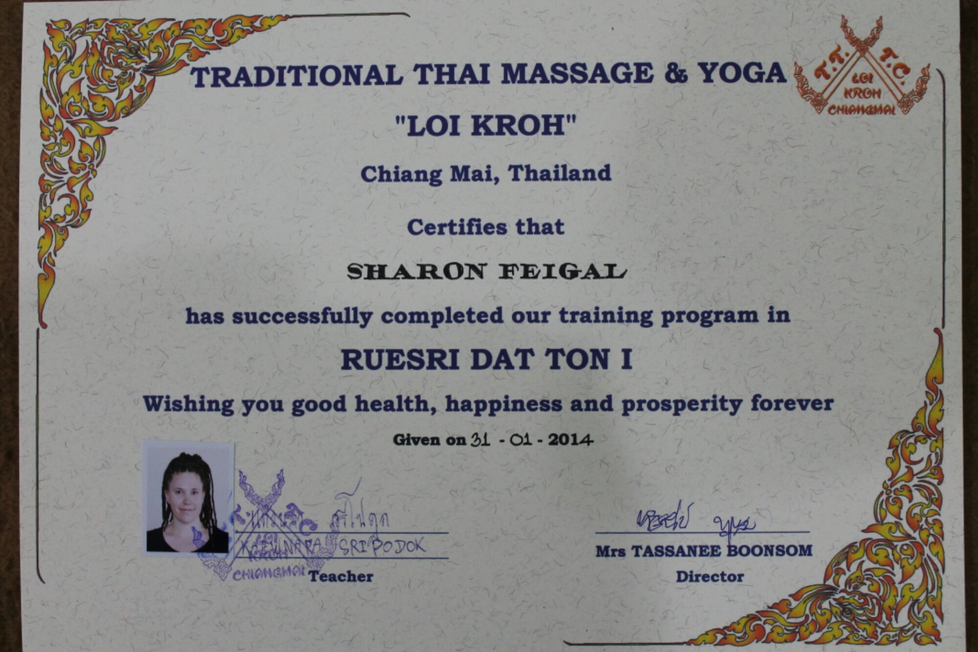 Ruesri Datton was excellent as usual. We had a new student, a man from Japan, probably about my age, definitely alternative. After class, I received my certificate, as well as a small gift from Napa: a beautiful calendar with photos of Ruesri Datton postures. It’s last year’s calendar, but it can be laid out to display only the photos, and is quite pretty. Napa said I’m welcome to join for her classes this week as well, if I have any energy left after massage classes. I will try!!
