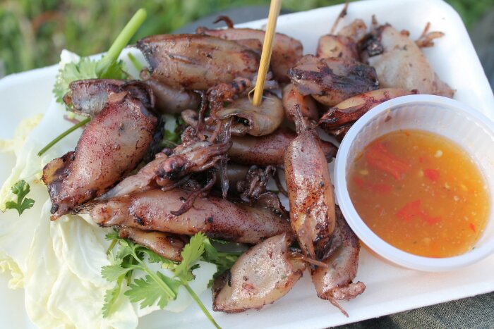 After the massage, I was hungry, and I remembered seeing a mango sticky rice stall, so I went looking for it. Near it, there was another stand of strange sea-beasties, this time smaller, grilled, and served with as spicy sauce. It turns out I think they’re the same beasties. Cuttlefish? Awesome yummy texture.