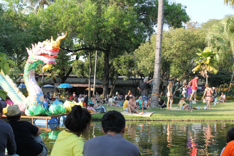 To eat, I sat in a patch of grass by the water. Across were various hippies and theater geeks: jugglers, tightrope-walkers, etc. The tightrope walkers strung a cord between a coconut palm and a fan palm, and everyone got in on trying it, including a group of teenage schoolgirls in uniform. There was a giant dragon floating in the water. It was very nice.