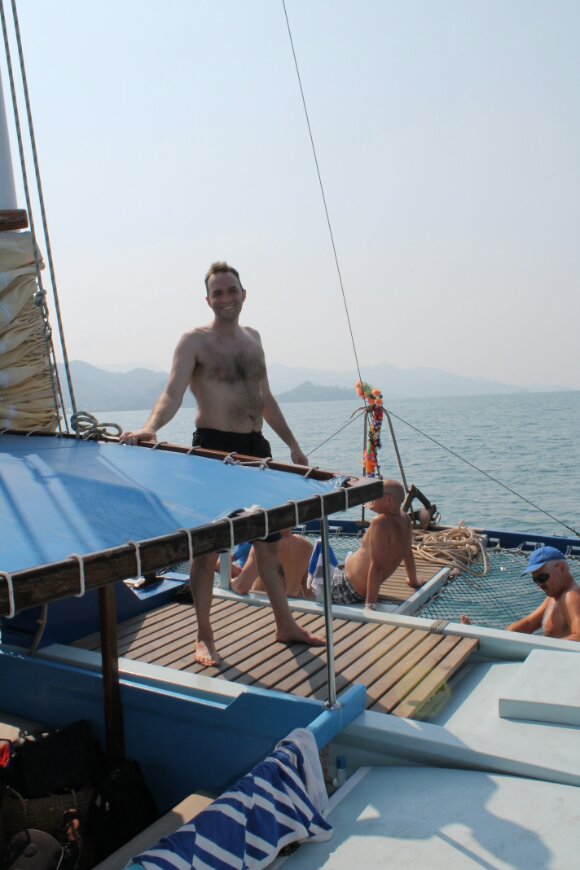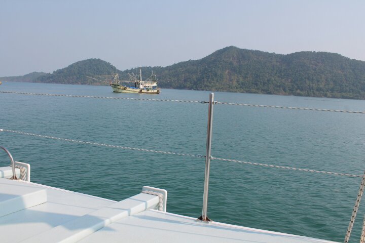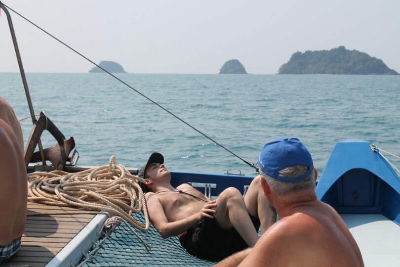 This time, the boat was much smaller, a catamaran with a maximum passenger load of 20 (we were 19) and a crew of 3. Our skipper was Michael, an interesting Belgian who’s been living on Koh Chang 7 or 8 months of the year for 7 years. Unlike the big boat last week, which had at least 50 passengers, we got time to chat with our fellow vacationers: 4 retirement-aged Dutch people from near Holten, 2 retirement-aged Norwegians from near Bergen, 2 young women from London (one French, one of Indian descent), and a solo French man, also retirement age, with very little English. The rest of the passengers were Swedish (3 youngish couples, 2 children) and they took over a large section in the front with one of the two net seats, and didn’t mingle with non-Swedish. The first question one of them asked as he boarded the truck on the way to the harbor was, in Swedish, “so, who’s Swedish?”