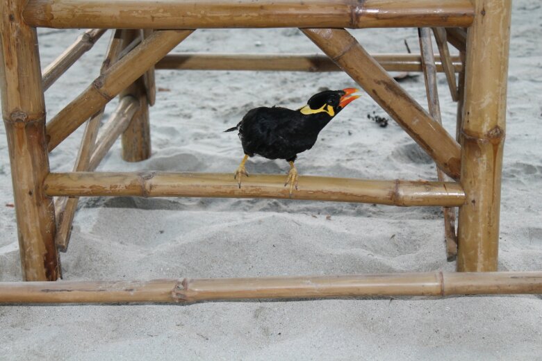 A man came out with a funny bird. The bird would hop away then return to him. After a while, he walked up to the bar behind us and the bird came and visited us for a while. It made very funny noises. Sometimes it almost sounded like human speech, then there would be a bird-like whistle.