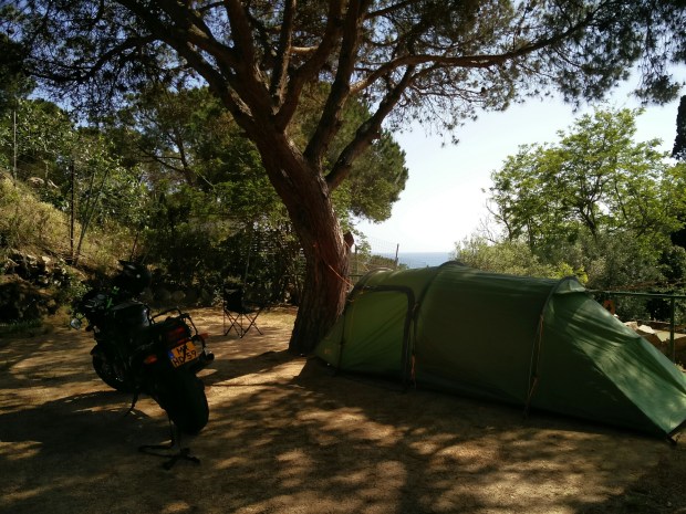 I had some trouble getting settled, but the Germans nearest me and the Dutch next to them came to my rescue (the ground, like most of these places, is hard and graveled, so you need a hammer and sometimes stronger stakes — most places either sell or lend them, but this one does not). I toiled for a while without help, but apparently looked so pathetic that they had to help me. The Germans are nice but don’t speak English or Spanish well, or rather, almost as bad as I speak German (some of you know just how bad that is). The Dutch people are from Bergen op Zoom and are super funny. We had a nice chat.