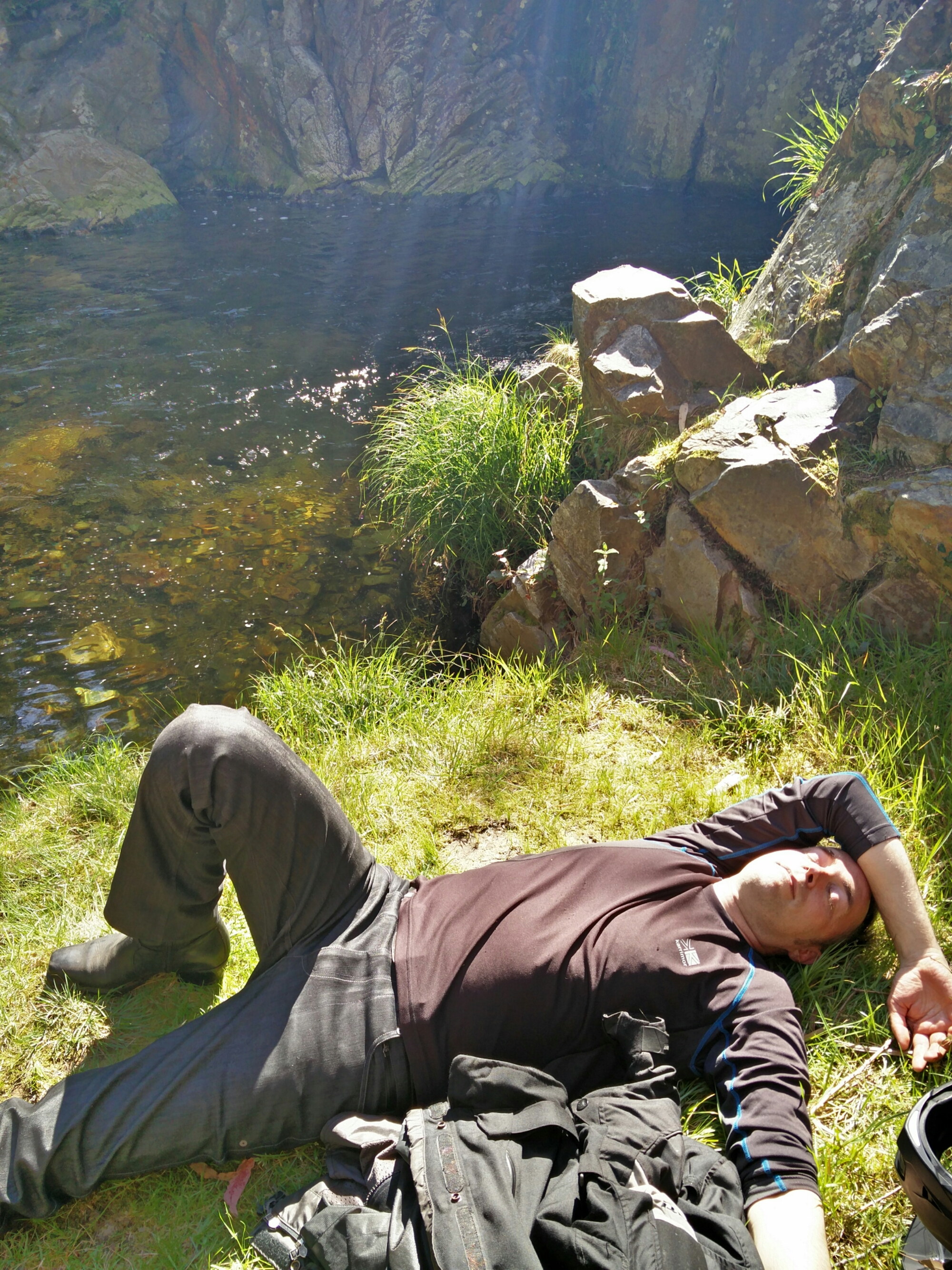 Much later, our best find of the day. I spotted a little clearing by a waterfall and a building (I couldn’t see what from the road), and slowed way down to look for a pulling off spot. Indeed, such a spot existed, and we walked down a little path that crossed the river diversion of this old mill. The water went through the building, but the mill stone is where Dick is sitting in this photo. The waterfall was about 3 or maybe 4 meters tall, and is behind me around the bend. The pool was deep enough for a nice splash if it hadn’t been so cold, and we hung out there for probably 40 minutes, just relaxing.