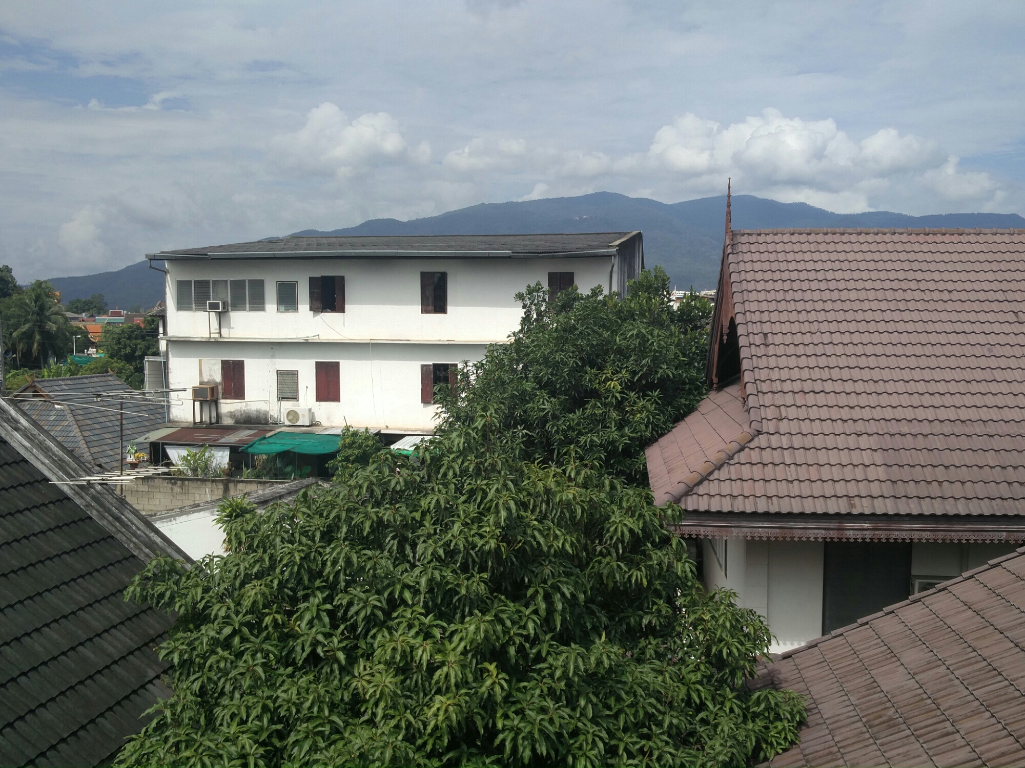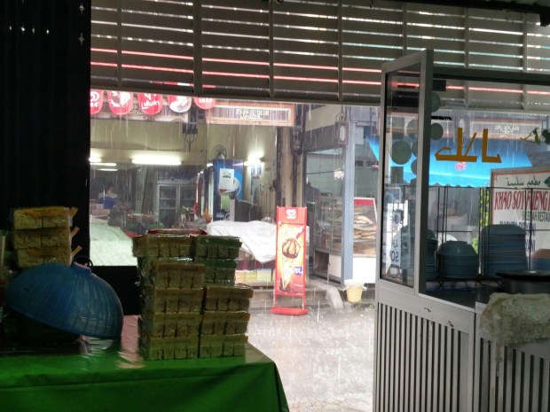 Khao Soi (spelled various ways), for those who’ve never been to CM, is a delicious soup (sort of) specific to this area. It has a red curry/coconut base, soft noodles in it, and fried noodles on top. It is usually served with fresh onions, lime, and pickled vegetables, although it sometimes isn’t, and sometimes has other things too. At some point in the next few days, I will be sure to get a picture, but I didn’t think to on Sunday. Instead, I took pictures of the rain outside, since a major downpour happened while I ate.