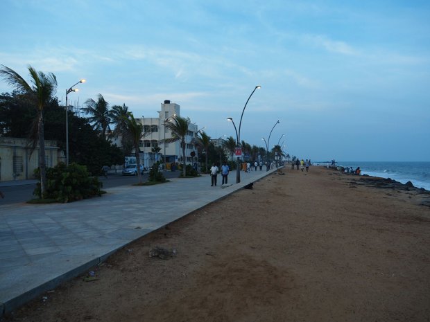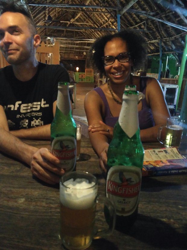 We arrived to Chennai around 07:30, but our arranged transport was not there. In the end, we took an Uber to Mamallapura, where we’d be staying the first night in order to see the Tiger Cave in the morning. It was a long drive, but pleasant, and we checked into our budget guesthouse with no problem. Matt and Abbie went for food while Derek and I took naps. My favorite thing about our guesthouse, which shared a courtyard with another guesthouse, was the stairway. Everything is so colorful here, and usually hand-painted and -lettered, although occasionally you will see stencils as well. After a nap, we headed out, first for some late lunch at a friendly but mediocre cafe nearby, then for Matt and me to get sim cards. Unfortunately, there were some problems with the sim, so it took much longer to do than it should have. Abbie and Derek headed to Shore Temple without us, but we took a tuk tuk and joined them at the 5 Chariots temple. On the walk back, we stopped in at another closed monument, but took pictures from outside. The sun had already set, but it was beautiful. Considering how long of a day it was, we were pretty pleased at all we’d accomplished thus far. We went out for dinner at another friendly and mediocre place (this is really a middle-of-nowhere town, not really a culinary hot spot) and discussed our plans for the evening and next day. Abbie and I went to negotiate a driver for our next day adventures; Matt went to get help with his still-malfunctioning sim card; Derek went for an early night, since he’d been unsuccessful with napping earlier. Errands run, the three of us remaining found the entire town camped out on the beach enjoying the breeze. We didn’t manage to finish our enormous beers.