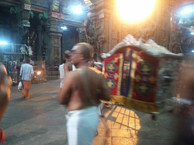 My favorite were two young women, in their late teens or early twenties. They were dressed for the occasion, and had flower offerings ready to go, but seemed really uncertain, and were hanging back with all the western tourists. When the man in the green lungi sat down, some of the other Hindus handed him offerings of money and flowers, so one of the young women worked up her nerve, egged on by her friend, and selected a flower from her arrangement. She came up behind him and tapped him gently on the shoulder with the flower. He didn’t seem to notice. She did it again, and someone he was facing gestured, and he turned and took her flower. This brought the two girls more prominently to the attention of the people in charge, and they tried to encourage them to walk around where they could properly make their offerings at the palanquin. This took a lot of “help.” The young women were so shy and uncertain, but eventually they got their offerings made and backed away nervously but smiling.