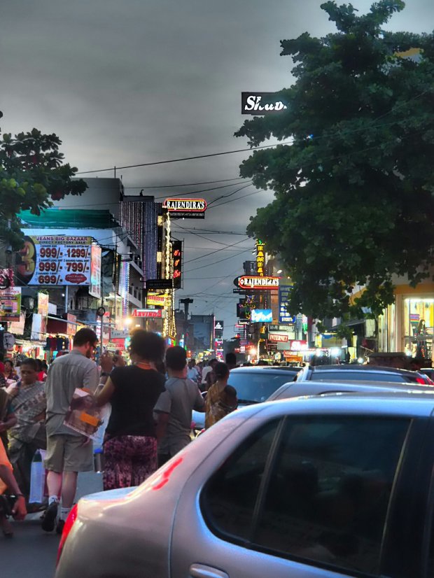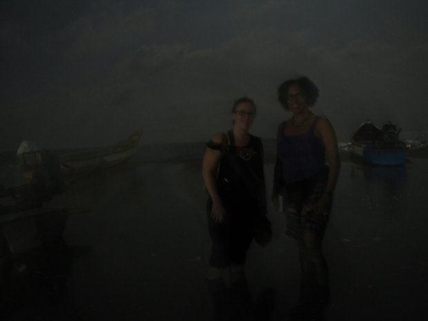 After swimming, we went back upstairs and cleaned up. Soon enough, everyone was ready to meet up for dinner, so we braved the rains (which were lighter anyway) and walked out into the night to find a restaurant recommended by the guidebook. It was delicious, and I discovered that paneer butter masala here in southern India is not at all the creamy thing served in Amsterdam or Minneapolis or other places I have been. It was spicy and rich and deep in color, with whole chunks of cinnamon in it. I’m also getting much better at one-handed tearing of breads, as well as just scooping up messes of sauce and rice with the fingertips of my right hand. All restaurants have hand-washing stations for before and after your meal.