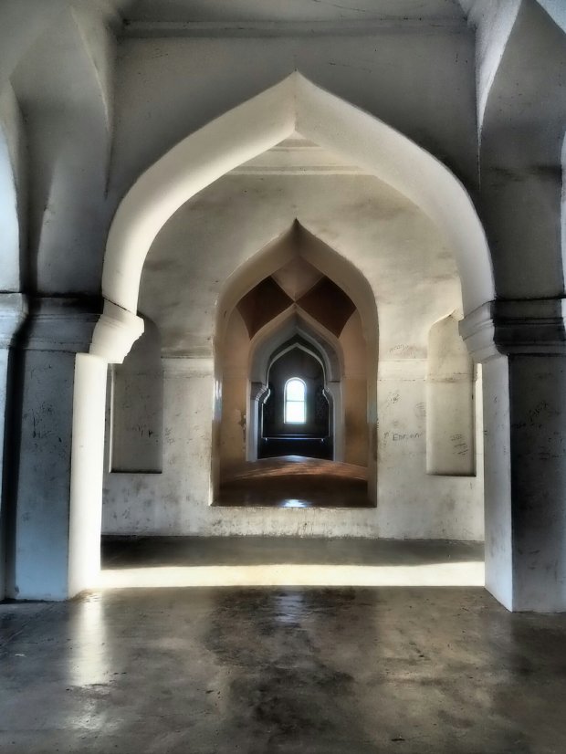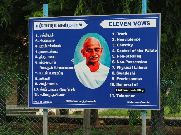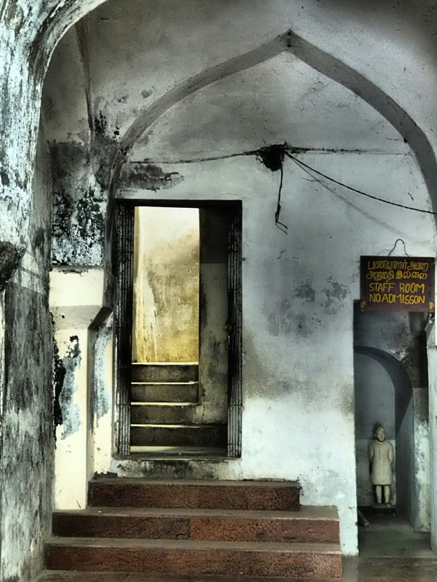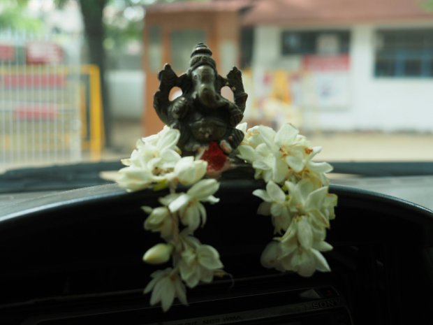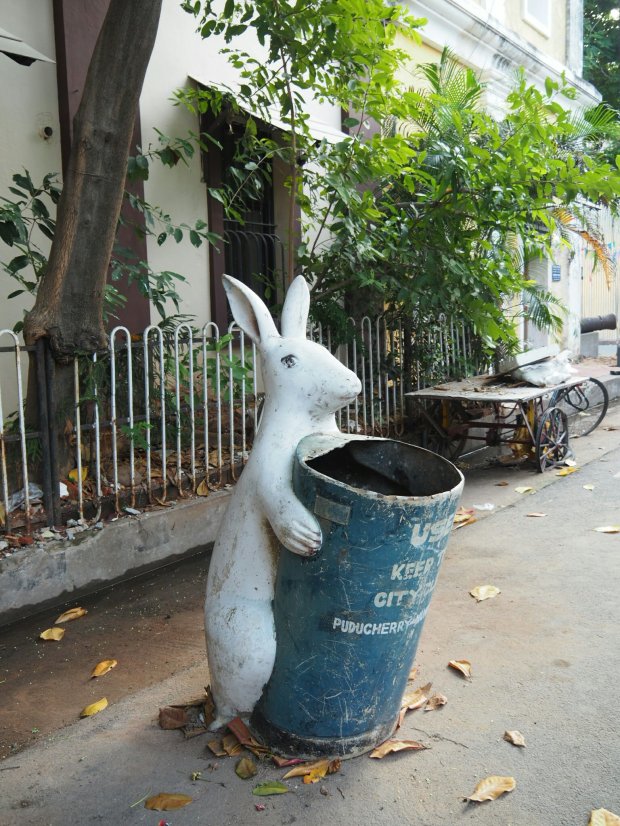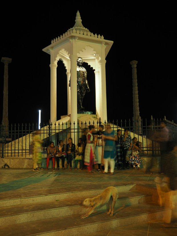 7 Oct 2017. On our first real morning in India (because airports don’t count), we lugged our bags down the colorful stairs, deposited them with the travel agent next door, and breakfasted across the street. A different driver than expected greeted us when we were ready, and we set off. Because I unfortunately suffer from carsickness, I get to enjoy the front seat. This also means negotiating with the driver and sometimes translating (trying to get used to someone’s accent and resay the exact same thing). But it’s fun, because I get to look out the window, which is really necessary since the carsickness makes it impossible to sleep or read. Even though our entire reason for going to Mamallapuram was for the Tiger Cave (the town is otherwise known for its stone carvers, and we did see many representations of this), the timeline just didn’t allow it. Fort Gingee from the road, very imposing. Our driver is from this area. He was also an excellent driver, a perfect combination of aggressive and cautious, avoiding all bumps and discomfort while honking his horn and overtaking almost everyone. The drive to Tiruvannamalai was about 3 hours, and Hindu temples close at 12/12:30 until 15/15:30. We got there in plenty of time. Roads have all kinds of traffic. As tourists, we are only allowed in part of the temple, the entryway. Like with many other temples from other faiths we have visited, shoulders and knees must be covered, and shoes removed. In this case, cameras are additionally forbidden, so we only have the outside of the complex. Within the complex, we were allowed to a certain point, but afterwards you must be Hindu. Abbie is actually officially Hindu, but has no proof and really knows nothing of it, so although it was tempting to try and get her in, it wasn’t very practical. We did pay money to the elephant, who blessed Abbie by tapping her on the head, but apparently my donation was insufficient (I only had 2 rupees on me at the time). We also received blessings at the lingam of Sri Maharsi. I thought lingam was the word for penis, a fertility representation, but I must have remembered wrong, because it was not. We were directed into a basement, where we made donations, and a red bracelet was first wrapped around our right wrists then sealed with white powder that was subsequently placed at our 3rd eye. Unlike the red bracelets I’m used to in SE Asia, this one is red woven nylon, like a shoelace. I’m not sure how long it will take to fall off on its own. Quite a while, I imagine. Our driver’s boss told me that this temple at Tiruvannamalai is a temple to a fire Shiva, in contrast to another one we hope to see later, to a dancing Shiva. This was our first experience with people trying to get things from us, but mostly they wanted to take selfies with us. This was so confusing at first, that we refused the first ones. I feel bad, now, because that first young girl asked very nicely. It’s just that I was still stepping out of the SUV, and it felt very abrupt. I am very taken with the crows here. They have gray heads, and like all crowd, are very clever. I may have been having a little discussion with one earlier the day I wrote this. After the temple, our driver took us to a nearby ashram, where we learned more about Sri Maharsi. This person was a teacher whose story starts at age 16 when he felt, for the first time, the fear of death. This info was being hand-lettered where we received the blessings, but was incomplete. Here it is, now, though, if you would like to read it. The ashram was very peaceful, and was on a route that would have been part of this story had we arrived only 2 days earlier. Every full moon, many hundreds of Hindu walk around the entire mountain. Our driver made a point to drive us along part of the route, where we saw many shrines and monkeys and sadhus (like crazy hermits). I asked him if he’d ever walked it, and he looked surprised and answered no, that it must take very long. But he also had an offering to Buddha on the front of his jeep, so maybe he’s not that much a Hindu. (Things here, like many places which practice some form of Buddhism, are very mixed, so you never really know. He was happy to talk about his small Ganesha statue on the dash and pendant hanging from the rearview mirror, both of which had fresh flower garlands. They must have worked, too, because we certainly encountered no obstacles.) Before leaving town, our driver recommended a lunch place which was wonderful. Delicious momos (small dumplings with various fillings, if you’ve not had them before) and some Indo-Chinese fusion stuff that was excellent. And then we sped onwards towards Pondicherry. We got a little lost coming into Pondicherry, so we passed a school science fair. More on that tomorrow! Our hotel, recommended by a friend of Abbie & Derek, is Les Hibiscus, and it’s exactly the kind of place I love. Colonial furniture, lots of green plants and interesting touches. It is very similar to my favorite hotel in Chiang Mai, where I’ve now stayed 3 times. Similar price range, too. If I ever return to Pondicherry, I would stay here again. We all had a rest, then walked to the boardwalk to get a feel. Like the beach in Mamallapuram, the entire town and all its visitors were there, parading and taking pictures. Many wanted to take selfies with us, so we finally learned to get into it. After a promenade, we went for dinner and drinks at a low-key place near our hotel. It was a lovely day all around! Because Pondicherry was a French colony town, there’s a strong Catholic presence. This was tucked into a tree, but Ganesha was in the next tree.
