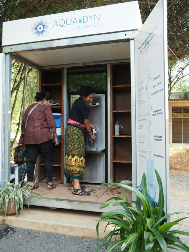 I’m not sure how to describe Auroville that will not make it sound like a cultist utopia. I grew up in southwest Washington state, where many figures from my childhood were involved with the cult of Ramtha, an Atlantean warrior supposedly channeled by a middle-aged American woman. Further, my work in and study of Thai traditional medicine and my experiences studying Chi Nei Tsang with Mantak Chia and his Universal Healing Tao organisation have made me very comfortable with the sometimes heavy woo factors in idealist philosophies. So read further with whatever grain of salt level you prefer. For example, did you know that “living water,” which is basically aerated and treated with music and lighting, is essential?