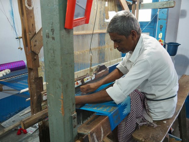 After the temple, our driver wanted to show us a neighborhood of weavers. They make saris and shawls from dyed silk and silk/cotton blend.