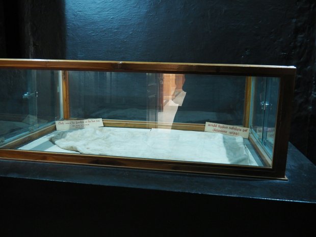The museum is well-arranged. A concise history of Britain’s involvement in India is presented in a series of panels, with pictures and vignettes into lives affected. The story continues in a numbered route through several rooms, with occasional objects of relevance as well, continuing on while Gandhi is introduced, from his youth and experiences as a barrister and living abroad, to his return and a detailed description of his involvements and works in India. Eventually, the path winds you around to his death. This cloth is bloodstained, and I admit I felt just a bit horrible taking a picture of it.