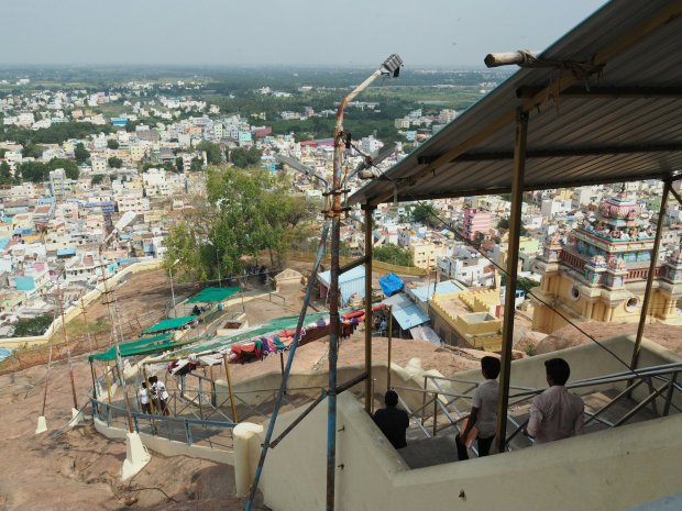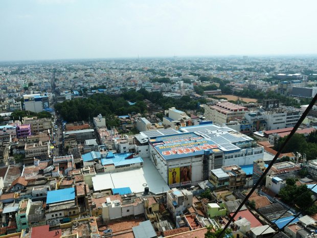 We hailed another tuktuk to return to the bazaar area. It was a busy area of streets surrounding the rock temple (more soon), dominated by “India’s largest textile showroom.” Here is a view of it from above, which we took later.